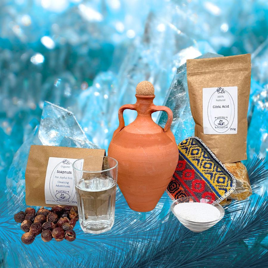 Tap water can be transformed using low-tech, ancient methods such as practised by the Greeks and Romans using clay amphorae. The World Health Organisation has established that clay vessels provide the best way to reduce chloride levels in water and to keep water bacteria free. For over a decade, Natural Spa Supplies has been manufacturing clay amphorae. Laboratory tests have shown that these amphorae reduce chloride levels, ammonia and heavy metals such as lead, cadmium, arsenic and mercury. There are no replacement cartridges or filters - from time to time, the amphorae just need a scrub on the outside and a sun bath! That's were the soapnuts, citric acid and scrubby come in.